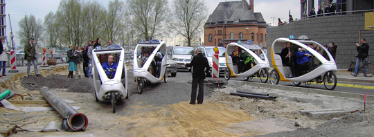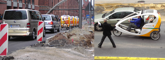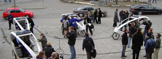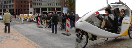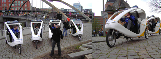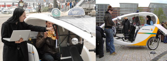 2 trompeten, 2 klarinetten, 4 fahrradrikshas, die hafencity: hausmusik, etüde, kammermusik, hymne, tanz, marsch: musikalische szenen von privatem und offentlichem verweben und trans- formieren sich durch den strassenraum.