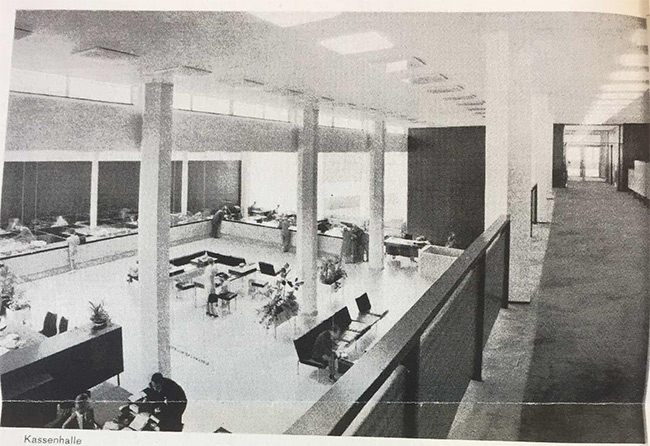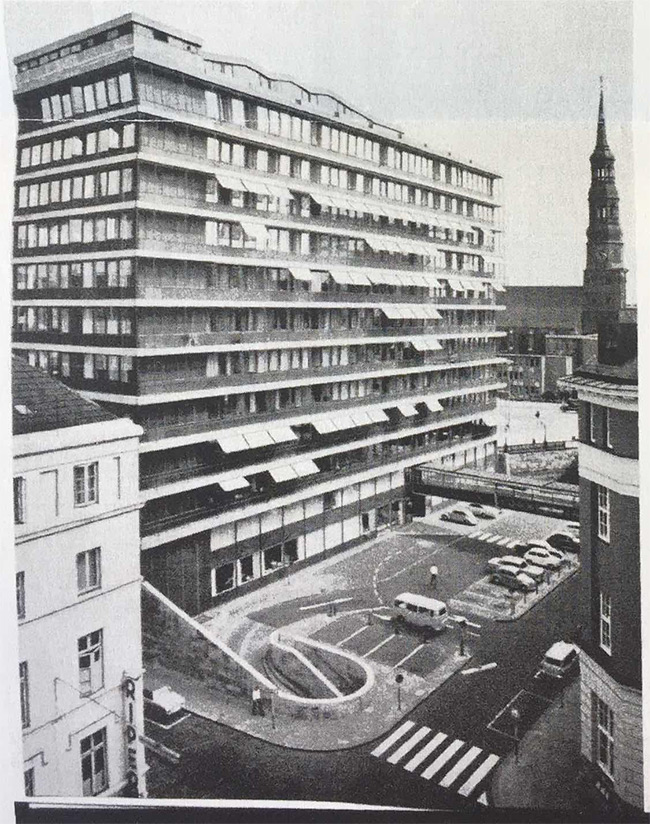 Heute wird der Brodschrangen rechter Hand vom weißen ehemaligen Stammsitz der Commerzbank von 1873 und dem Erweiterungsbau auf der linken Seite geprägt, die mit einer Brücke verbunden sind. Das dreizehngeschossige Verwaltungshochhaus ist als Kulturdenkmal gelistet. 1960-63 vom Architekten Godber Nissen gebaut, war es zu seiner Zeit der erste Bau in Hamburg, der umlaufende Galerien besaß, die mit Geländerstreben gesichert sind und sowohl als Arbeitsbühne für Reinigungszwecke - sprich für das Putzen der Fenster - wie auch als Fluchtwege dienten. (3) Die stilvolle Inneneinrichtung der 60er, für die Design-Junkies heute einiges an Geld liegen lassen würden, ist nur auf Fotos überliefert. Und die Verkleidung der Obergeschosse aus patiniertem Kupferblech wurde bei einer Modernisierung durch dunkeleloxierte Metallelemente (4) ersetzt und damit verschlimmbessert. Eigentlich verbindet dieser Erweiterungsbau architektonische und städtebauliche Ideale der Nachkriegszeit und „ist ein wichtiges Beispiel für das Leitbild der aufgelockerten Stadt“. Denn der historische Stadtgrundriss wurde hier nach den Zerstörungen des 2. Weltkrieges gravierend verändert.