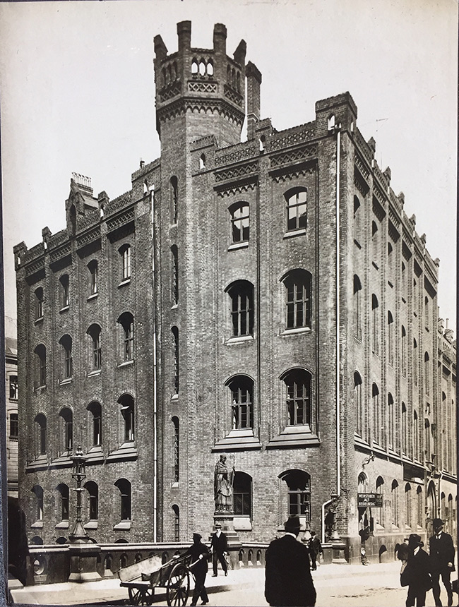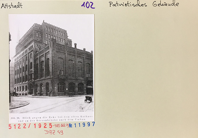 Foto: Bildarchiv des Denkmalschutzamt Hamburg. Bevor man den Platz zwischen den beiden Bank-Gebäuden überquert lohnt es sich, einen Abstecher in den Neß zu machen. An dessen Ende, dort wo er sich in die Trostbrücke und die Börsenbrücke teilt, sieht man schon von weitem eine beeindruckende Burg. Zumindest sieht das Gebäude aus wie eine rote Backsteinburg. Selbst die neuerdings dort ansässige Filiale der Burgerkette Peter Pane kann nicht darüber hinwegtäuschen, dass hier einst Geschichte geschrieben wurde. Denn genau an dieser Stelle hatte das Hamburger Rathaus Nummer vier an der Trostbrücke gestanden. Es verschwand würdig im Sinne einer größeren Sache: Um den Großen Brand von 1842 zu stoppen griffen die Hanseaten zu etwas ungewöhnlicheren Maßnahmen und sprengten ihr Rathaus in die Luft um den Flammen Einhalt zu gebieten. (6) 1843 wurde der Platz der Patriotischen Gesellschaft übereignet, die sich 1765 gegründet hatte um den Geist der Aufklärung zu verbreiten und die Künste und nützlichen Gewerbe zu fördern. (7) Den Wettbewerb für das Gebäude gewann der Architekt Theodor Bülau, der den Patrioten eine regelrechte Trutzburg baute. Lange wurde sein Bau nicht akzeptiert, der arme Mann war seiner Zeit weit voraus. Heute, wo Klinkerfassaden en vogue sind, hätten die Bauherren und Architekten vermutlich ihre Freude an ihm. Damals jedoch war Backstein als Fassade repräsentativer Gebäude nicht vorgesehen und die Ziegeleien rund um Hamburg waren nicht darauf eingerichtet seinen Vorstellungen feiner Profile und Farbtöne des Steins nachzukommen. Zunehmend Ansehen gewann der Bau erst nach und nach, u.a. durch die Aufstockung mit vier weiteren gestaffelten Dachgeschossen durch die Architekten Klophaus, Schoch und zu Putlitz in den Jahren 1923 und 1924. (8)