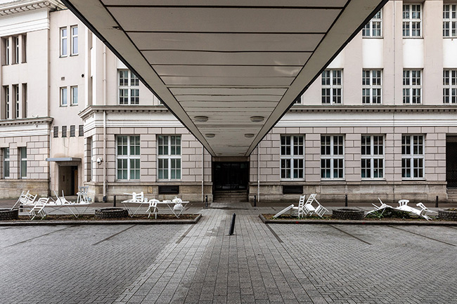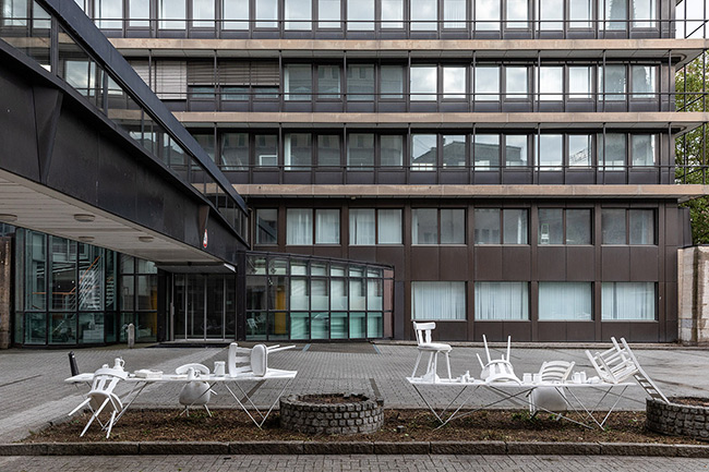 Die weiße Installation aus Tischen und den umgedrehten Stühlen erweckt den Eindruck, als sei hier ein Mahl gerade erst beendet worden, die Kellner haben nur noch eben die Stühle hochgestellt um einmal fix durchzuwischen... Damit befinden wir uns mitten im Thema, denn der Straßenname „Brodschrangen“ leitet sich tatsächlich vom Brot ab. Hier wurde früher das „Brod“ der Bäcker verkauft - die Verkäuferinnen saßen unter Schirmdächern, die an den Häusern angebracht waren. (1) Die erste Erwähnung des Brodschrangen findet sich im Stadt-Erbe-Buch 1248-1256. Einen „Fleischschrangen“ gab es übrigens ebenfalls – dieser wurde 1265 von der Stadt erworben, der Brodschrangen war ab 1273 öffentliches Eigentum. (2)