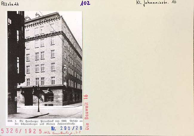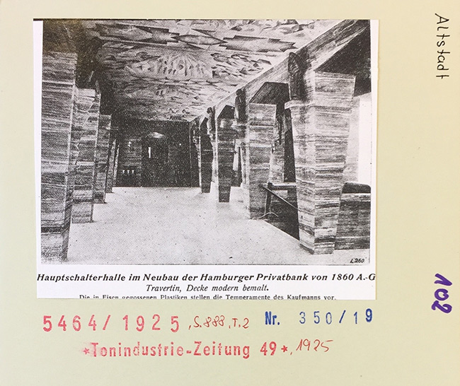 Fotos aus: Die Bauwelt 16, H 26 Kunstbeilage, S.1-4, Die Privatbank von 1860 in Hamburg, Architekten Stövhase und Hartjenstein, aus dem Bildarchiv des Denkmalschutzamt Hamburg.