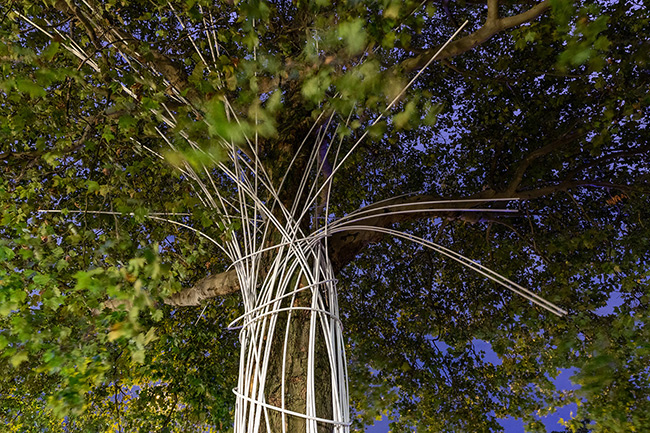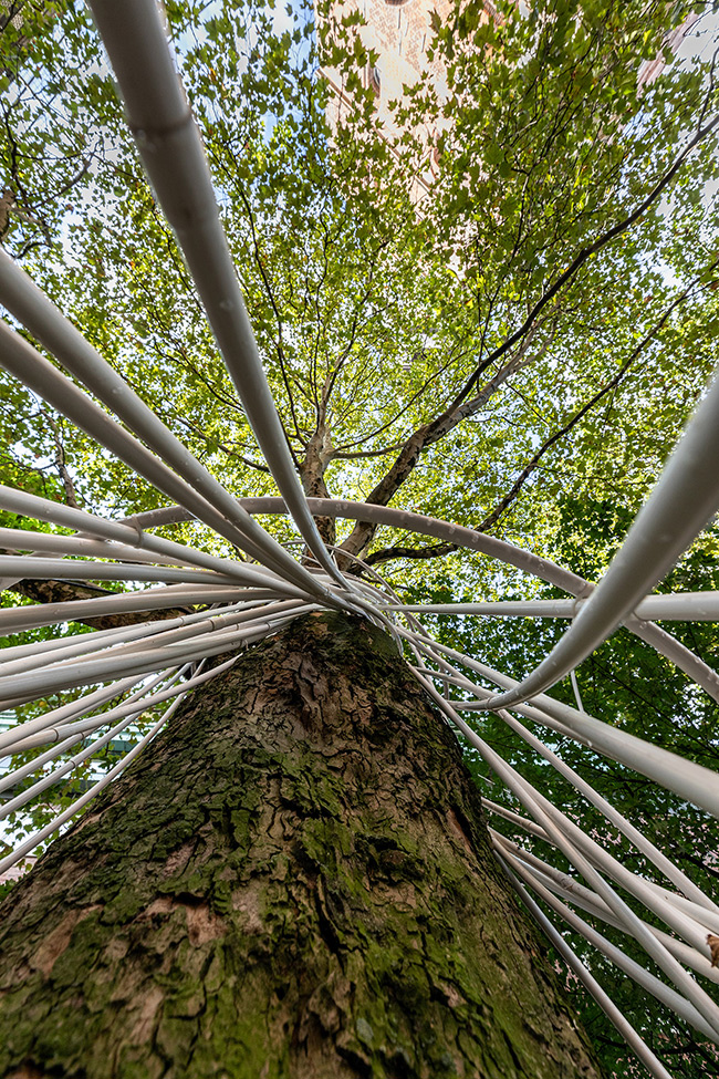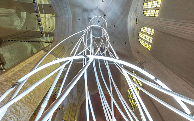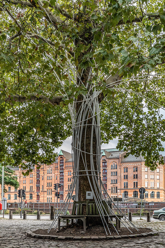 Die inhaltliche und geographische Klammer zwischen dem Rathaus und der Katharinenkirche schließt sich also genau hier – die Katharinenkirche auf dem Giebel des Rathauses hat eine ihr sehr ähnliche Schwester an der Südseite des Turmes. Die Skulptur aus Sandstein datiert auf 1639 und stammt vom alten Bau der Katharinenschule. (1) Eine sehr viel moderne weitere Schwester steht mit wehendem Haar auf dem Ostgiebel über dem Chor und segnet von dort oben aus Stadt und Hafen. Andere historische Damen der Familie finden sich auch im Innern der Kirche, u.a. eine farbig gefasste Holzfigur aus der ersten Hälfte des 15. Jahrhunderts und eine weitere von etwa 1500. Dort innen bekommen sie einiges geboten. Denn in dem schlicht-eleganten Kirchenraum werden nicht nur Gottesdienste abgehalten. Er ist heute das Zentrum eines lebendigen Quartiers in dem gelebt, gewohnt und gearbeitet wird, in welchem es eine Kita, eine Schule und einen Wochenmarkt gibt. In der Kirche selbst finden Konzerte, Lesungen und Ausstellungen statt. So sind die weißen Schaukeln im Baum auf dem Katharinenkirchplatz nicht zuletzt eine Reminiszenz an eine Performance, die der Künstler Arne Lösekann im September 2017 in der Kirche aufführte. Zusammen mit dem Denkmalschutzamt und dem mobilen Kino „Flexibles Flimmern“ gab es zum Tag des Offenen Denkmals Geheimnisse aus Pracht, Verfall und Wiederaufbau St. Katharinens zu entdecken, die sich mit den performativen Interventionen aus Installationen und Projektion von Arne Lösekann verwoben. Aber auch zahlreiche andere Künstler haben die Kirche mit spannenden Perspektiven gefüllt. Erst vergangenes Jahr beherbergte St. Katharinen temporär Werke von Ai Weiwei, Vanessa Beecroft, Joseph Beuys, Asta Gröting und Rebecca Horn. (2)