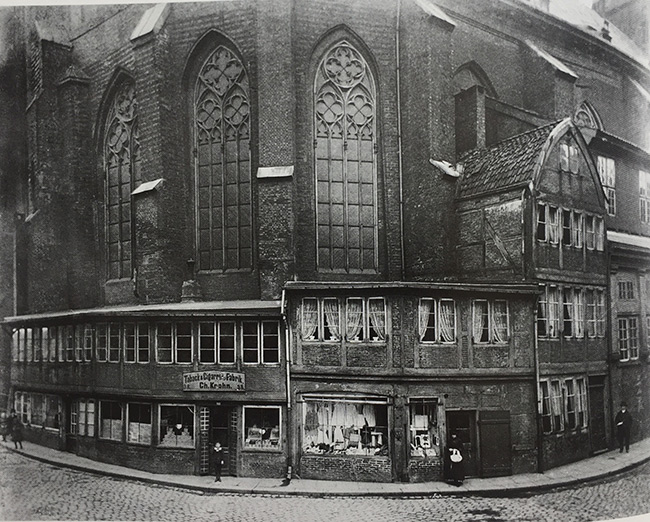 Foto: Arne Lösekann Bevor wir den Innenraum betreten lohnt ein Gang rund um die Kirche, denn es gibt viel zu entdecken, u.a. alte Portale oder die Treppe zum Turm, dessen 23 Meter hoher Unterbau das älteste aufrechtstehende Bauwerk Hamburgs ist. Insgesamt hat der Turm eine stolze Höhe von 116,7 Metern vorzuweisen. Darin hängen heute 5 lautstarke Glocken, eine davon ist von 1626, die anderen wurden nach dem zweiten Weltkrieg erneuert. Eine beschädigte Stundenglocke von 1454 ist in der Turmhalle der zu sehen. In der Länge misst die Kirche außen 75,5 Meter, innen ist das Kirchenschiff 56,07 Meter lang, 28 Meter breit und im Mittelschiff 26 Meter hoch. (3) An vielen Stellen der Außenmauer erkennt man, dass Teile verschiedenster Bauphasen im Mauerwerk aufeinandertreffen. Heute kaum mehr vorstellbar ist, dass an den Chor noch bis 1888 zahlreiche kleine Gebäude direkt anschlossen. Wohnen mit Gottes Segen oder so ähnlich... 1888 wurden die Gebäude abgerissen. (4)