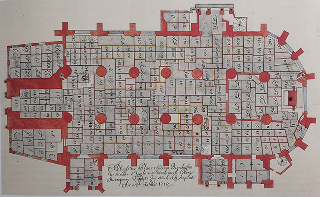 Was jedoch fehlt ist – richtig, ein Friedhof. Das war allerdings nicht immer so. Denn bis ins 18. Jahrhundert wurden die Toten direkt in der Kirche in Grüften bestattet. Ein beeindruckender Gräberplan aus dem Jahr 1710 führt dies eindrucksvoll vor Augen. Die Lebenden waren hier mit ihren Toten eng verbunden. Die Gräber unter dem Fußboden waren durchgehend bis in die Zeit der französischen Besatzung von 1811 bis 1814 angelegt – erst die Franzosen verboten die Bestattung innerhalb der Kirchen. (5) Das hätte vermutlich im wahrsten Sinne des Wortes die Pferde scheu gemacht. 2.200 Stück wurden im Winter 2013 von Napoleons Marschall Davout in den Kirchen St. Petri, St. Katharinen und St. Jacobi untergebracht. Als die Gemeinden ein Jahr später mit dem Abzug der Franzosen ihre Kirchen wieder betreten duften waren die Schäden groß und ebenso der Schrecken. Schuld waren allerdings nicht die Tiere, sondern die Soldaten, die die Gräber teilweise aufgebrochen und die Platten zerschlagen hatten.
